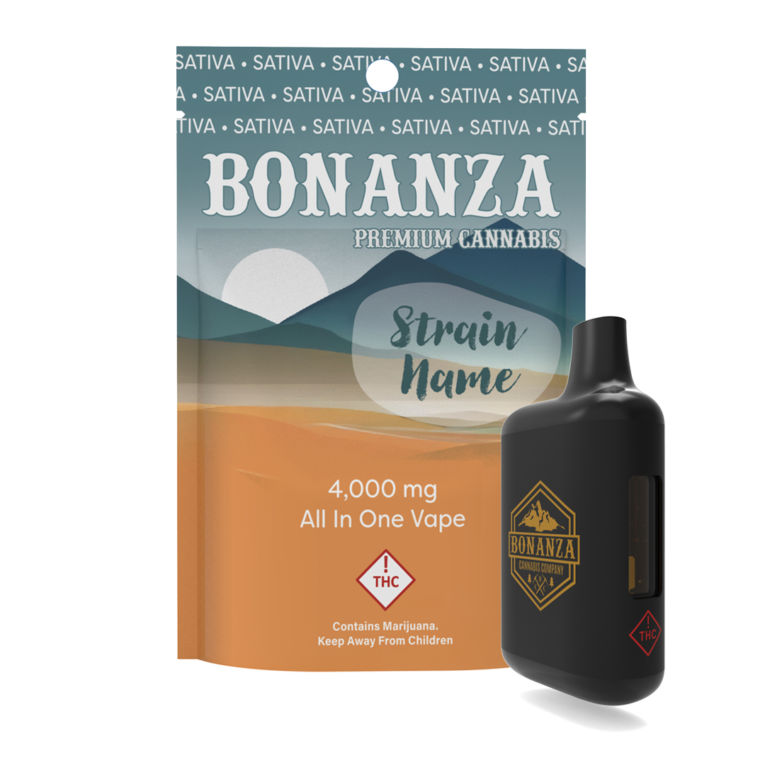 Bonanza All-In-One Vapes combine convenience and quality in a sleek, disposable design. Each device contains 4 grams of strain-specific cannabis extract, delivering smooth vapor, bold flavor, and consistent effects without the need for charging or refilling. Perfect for easy, on-the-go use, Bonanza AIO vapes are ready whenever you are. STRAIN TYPE: Sativa-dominant.