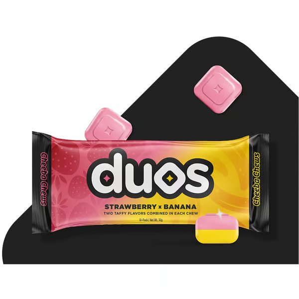 Cheeba Chews have taken award winning fruit taffy flavors and given them a new delicious partner, by pairing our strawberry with a banana taffy. Combining these flavors has created a new power couple that contains a true hybrid blend of cannabinoids for amplified effects. INGREDIENTS:Glucose Syrup, Sugar, Natural Flavor, Egg Whites, Mono - Diglycerides, Malic Acid, Citric Acid, Natural and Artificial Colors.