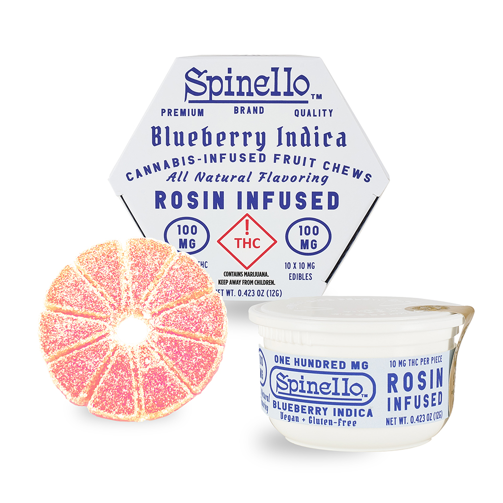 Enjoy Spinello! Served in a stay fresh case, our delicious Blueberry Indica fruit chews are infused with premium live rosin in an easy dose, break-away gummy. Vegan, gluten free, and made with all natural flavors, each fruit chew contains 10mg THC per serving, with 100mg THC total per package. Taste the difference today.